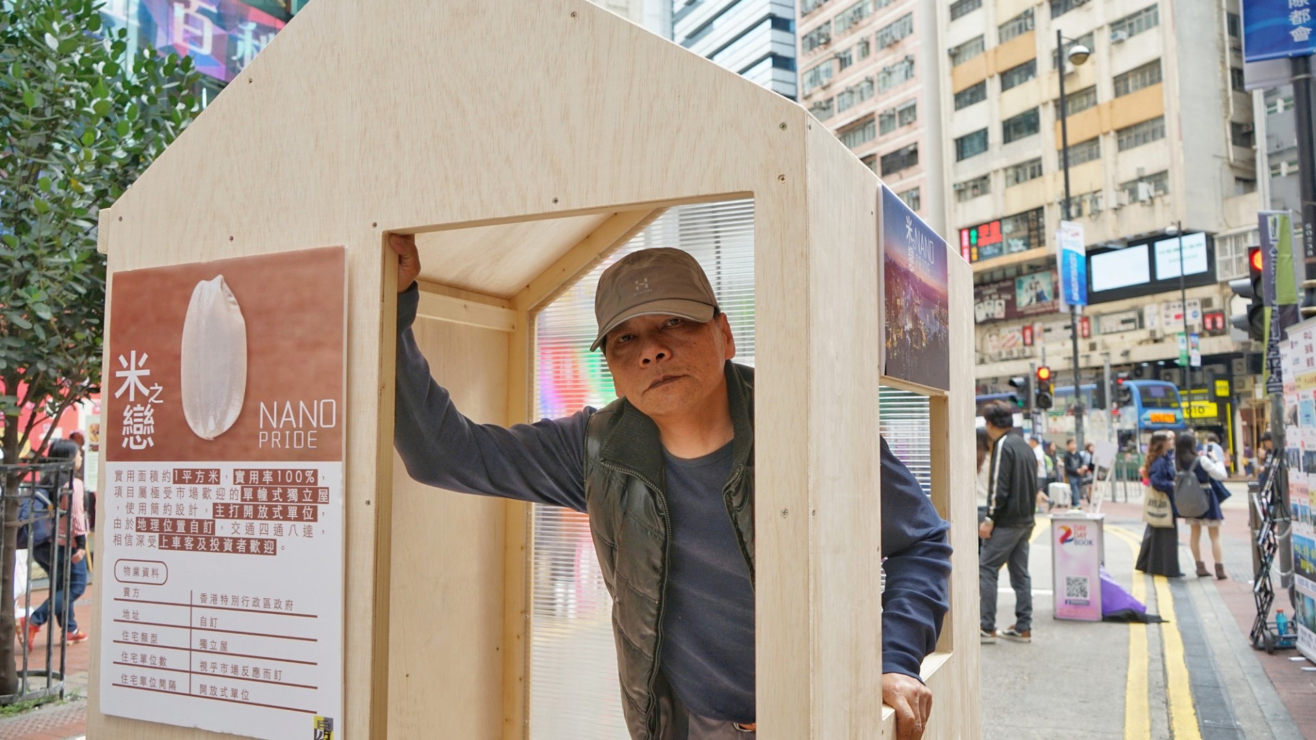 全港關注劏房平台今(20日)於銅鑼灣鬧市展出全港最細、1平方米獨立屋「米之戀」示範單位,諷刺本港住宅單位愈劏愈細,納米盤、龍床盤湧現,促請港府需按聯合國建議的「適足住屋權」,制定本港的基本居住標準,包括人均面積、租務管制等,從而作為長遠房屋政策目標。 |