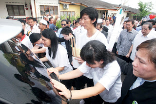 趙明福家屬週三下午2時抵達沙亞南法庭,在入口處與全民挺明福運動的成員見面。左起:陳文華、明福父親趙亮輝、妹妹趙麗蘭、哥哥趙明基和母親張秀花。(圖:星洲日報)