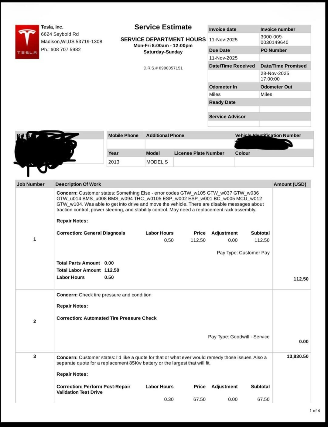一位2013款特斯拉Tesla Model S車主在社交平台發帖反映,車輛電池發生故障後陷入維修成本過高、轉售價值過低的兩難境地。