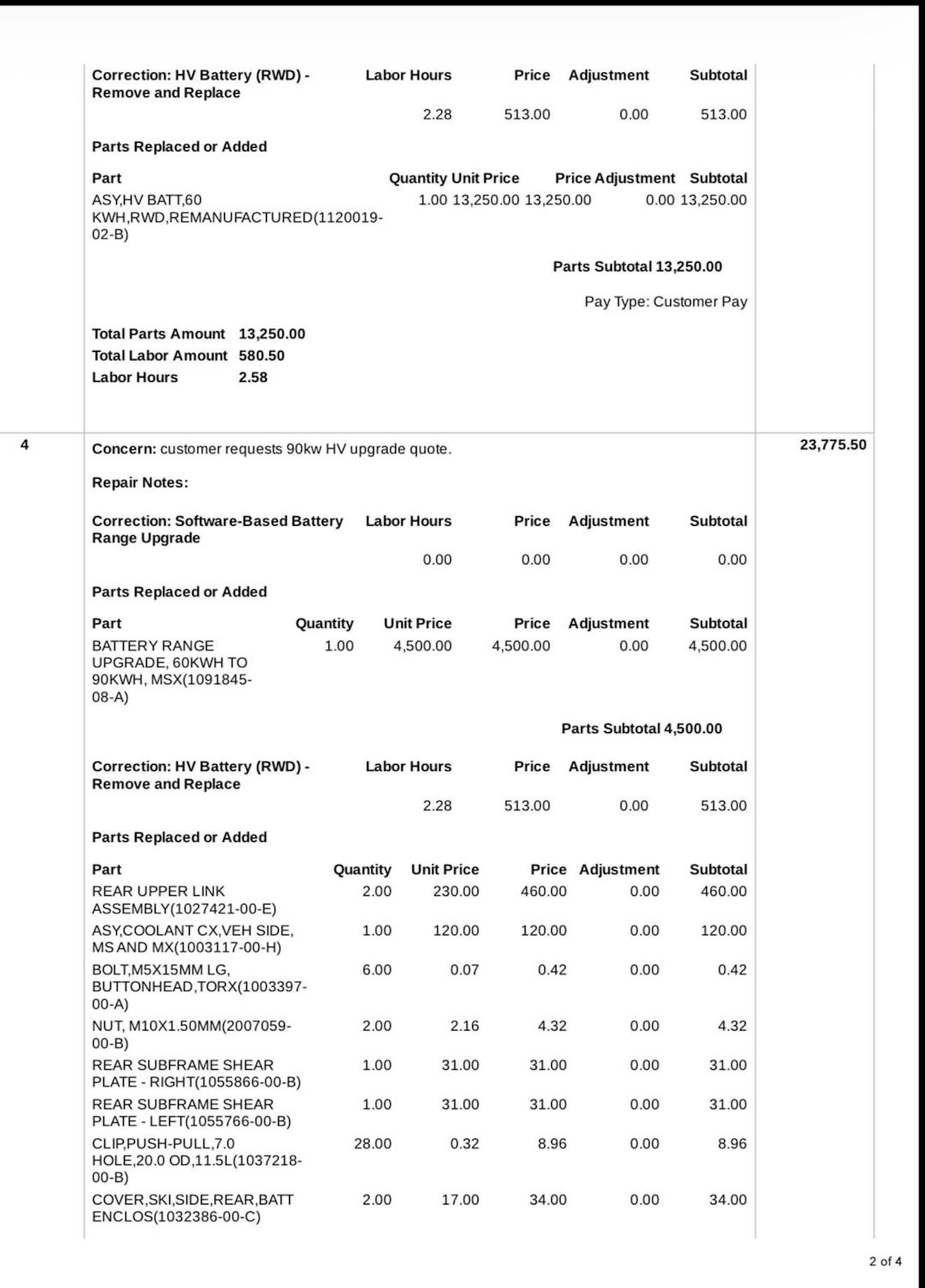 該車主前往美國威斯康星州麥迪遜的官方服務中心尋求維修支持,對方提出兩種解決方案:一是更換同規格的60千瓦時電池包,二是升級為90千瓦時電池包。