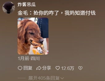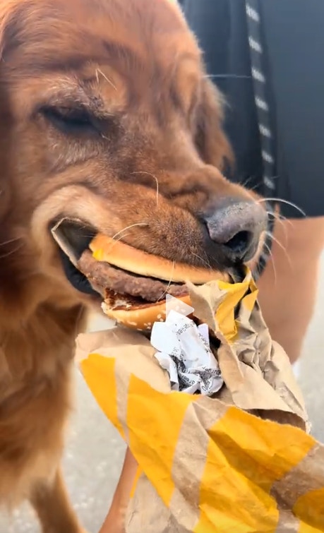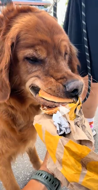 博主剛剛在麥當勞買的漢堡,下一秒一隻大金毛從旁邊路過,竟然直接一口咬住了漢堡!(抖音@吱嗚哥哥)
