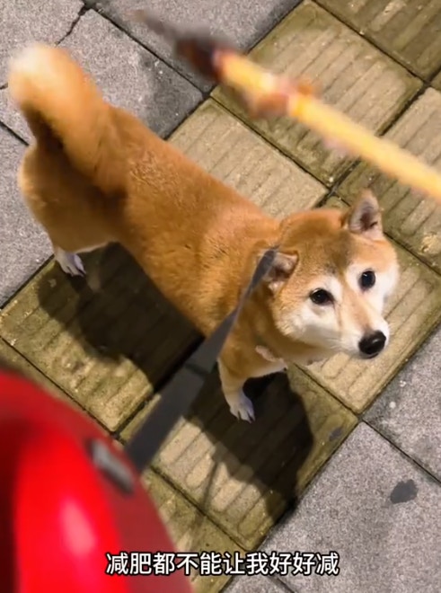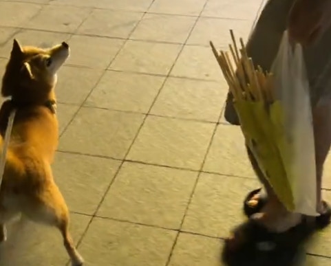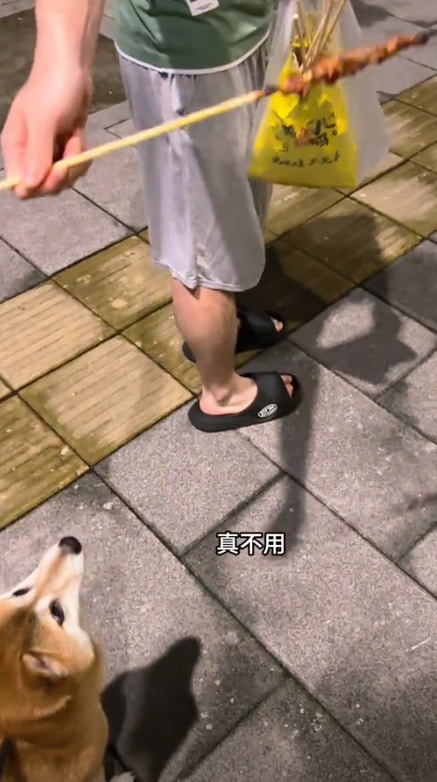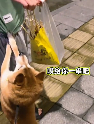 這隻柴犬看見有人拿了一袋肉串就開始向路人乞食(抖音@皮裏皮氣)