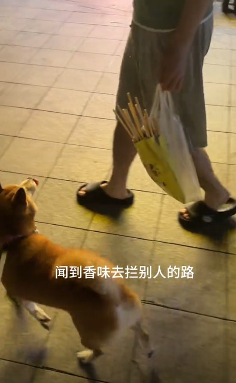 狗子聞到肉肉的香味後瞬間不能自已,前去攔路,牠雙眼緊盯着烤串,甚至,還想和那人一起回家,可以說是把背後的主人完全忘在了腦後......