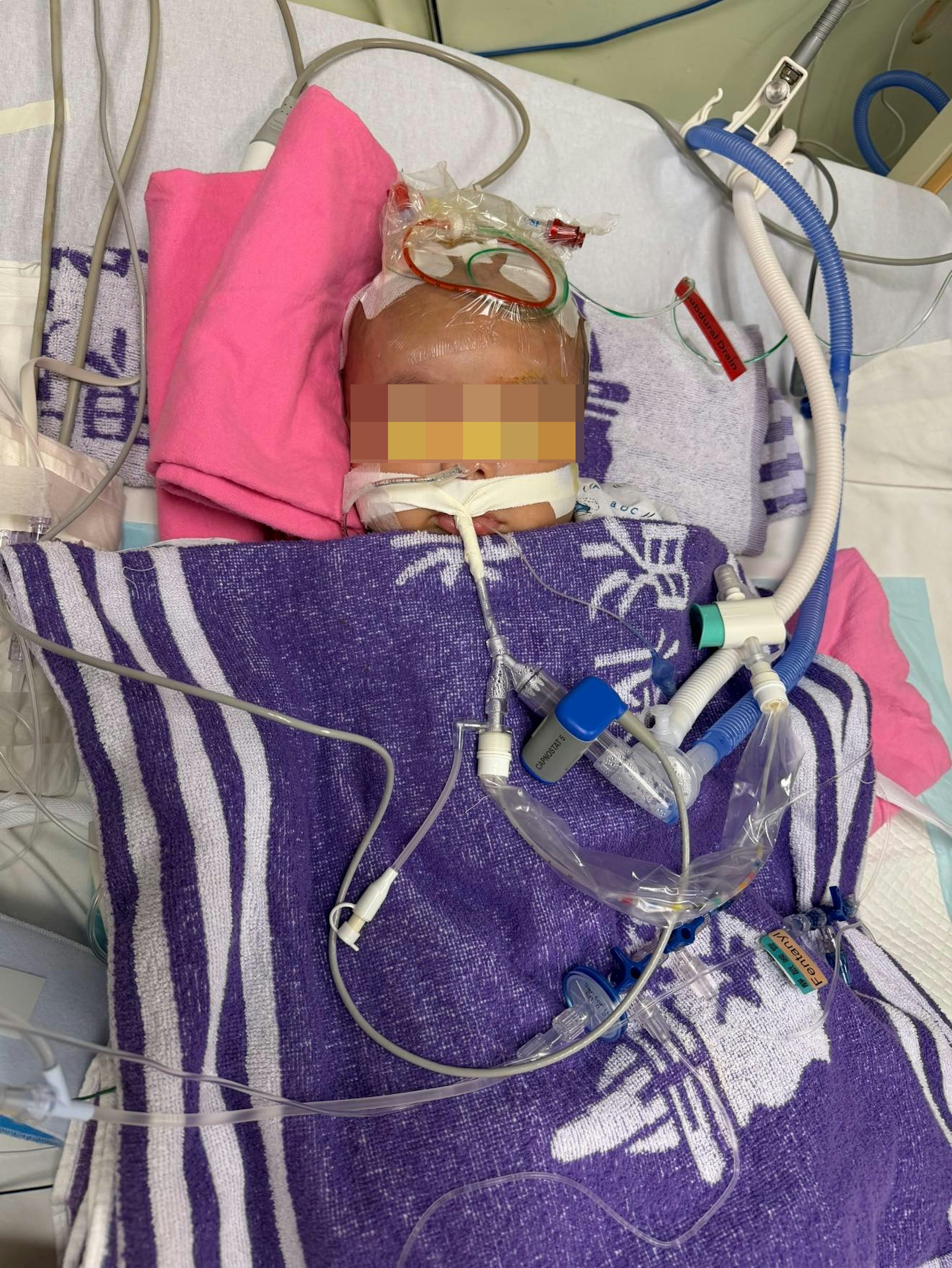 4個月大男嬰「細波」疑遭外傭大動作搖晃及叉頸虐待,導致腦出血要接收緊急手術,在醫院兒童深切治療部留醫。 (「細波」父親盧先生提供)