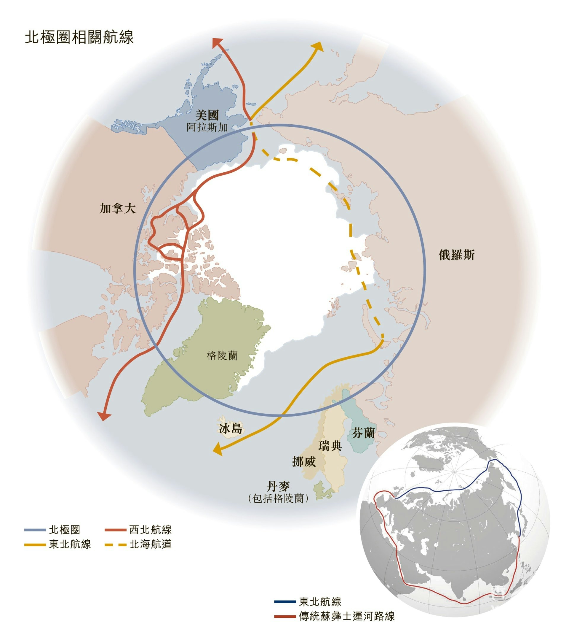 2 i: f, H( \0 I北極航線主要由兩條航線組成,一是俄羅斯以北的東北航線,從白令海峽開始,穿過楚科奇海、東西伯利亞海、拉普捷夫海、喀拉海、巴倫支海到達北歐;另一條是加拿大和美國阿拉斯加北面的西北航線,由戴維斯海峽開始,穿過加拿大北極群島、美國阿拉斯加到達白令海峽。(香港01製圖)tvboxnow.com# ]8 U/ I- p. o4 Q, A* `