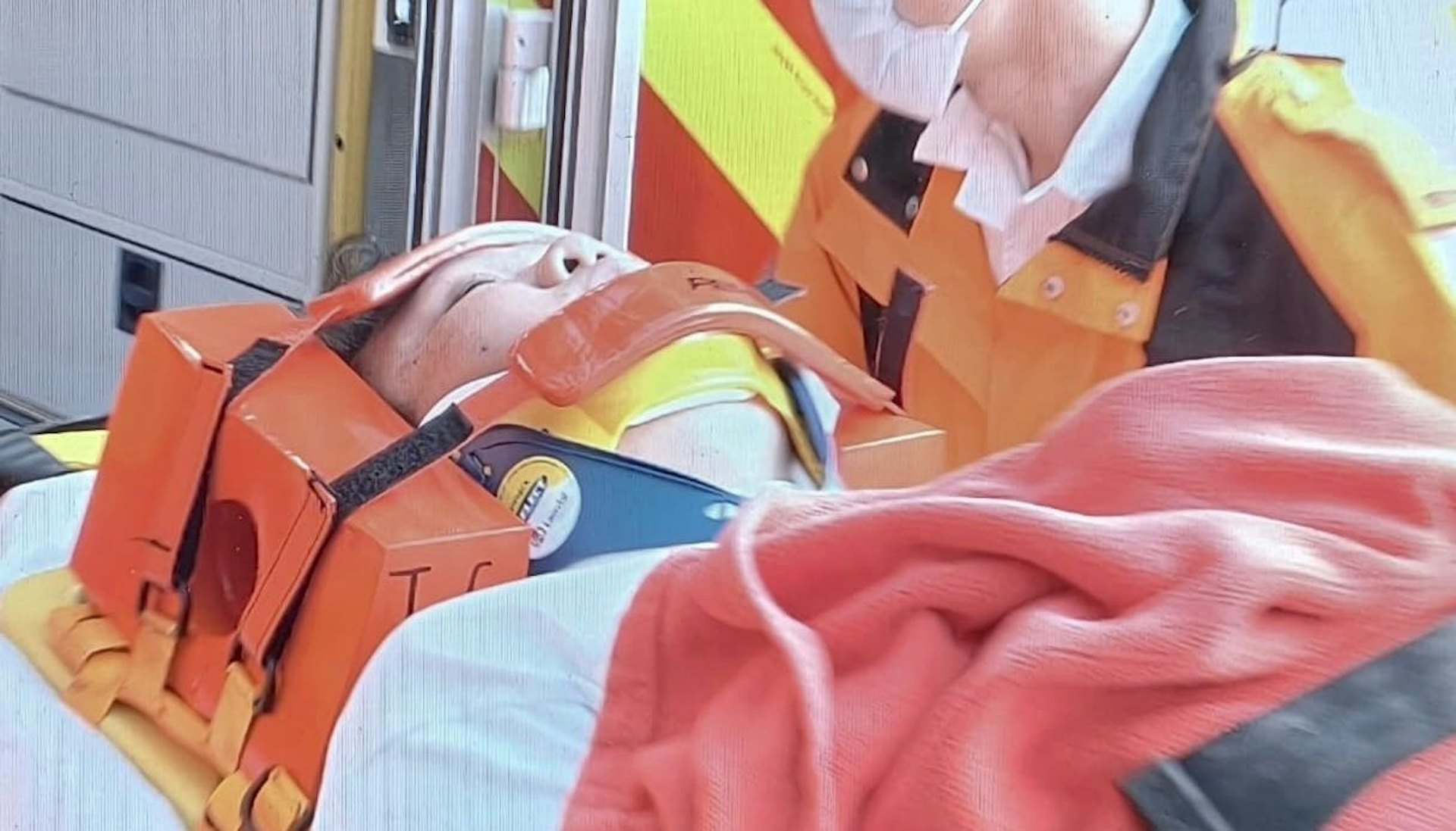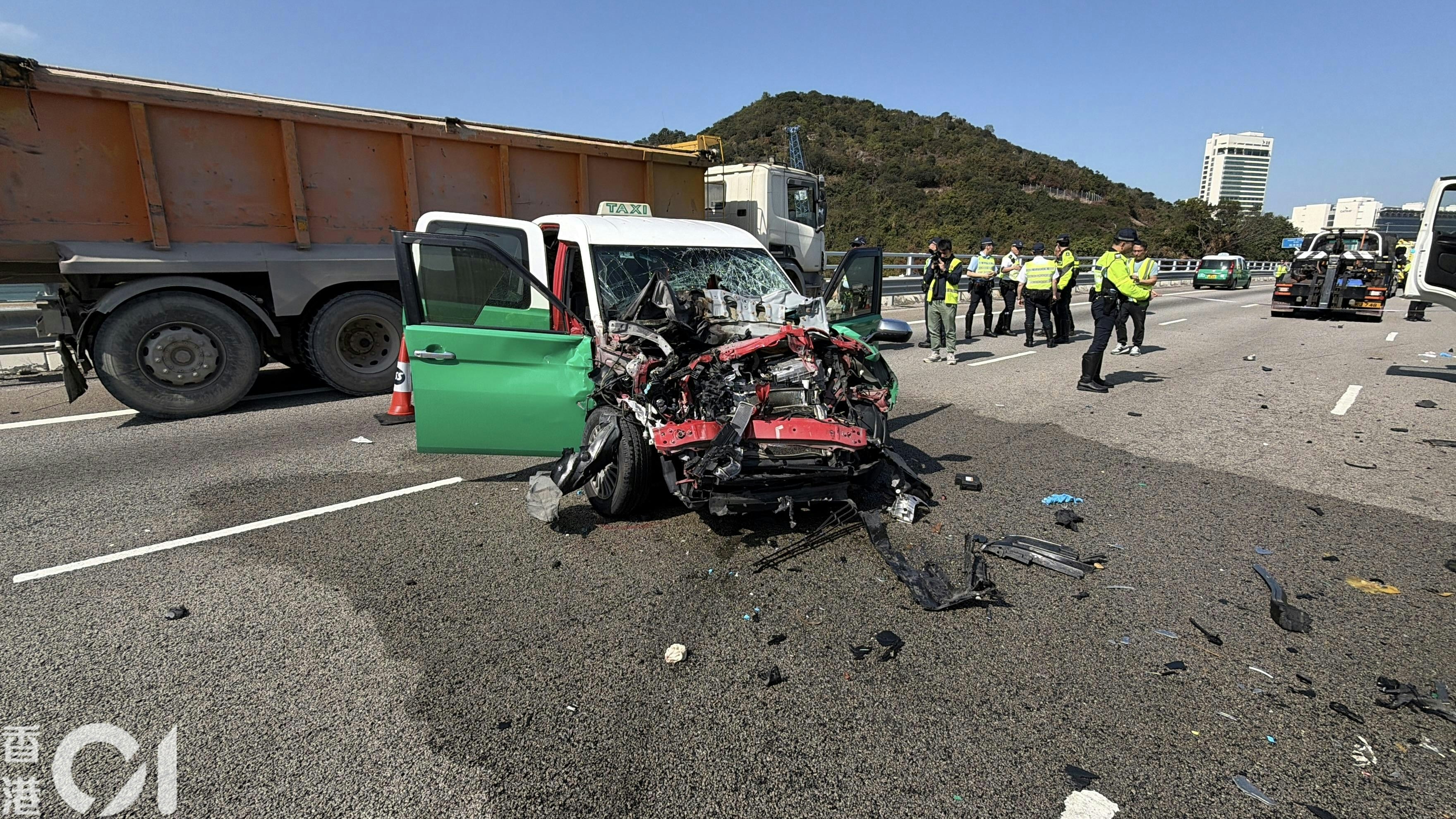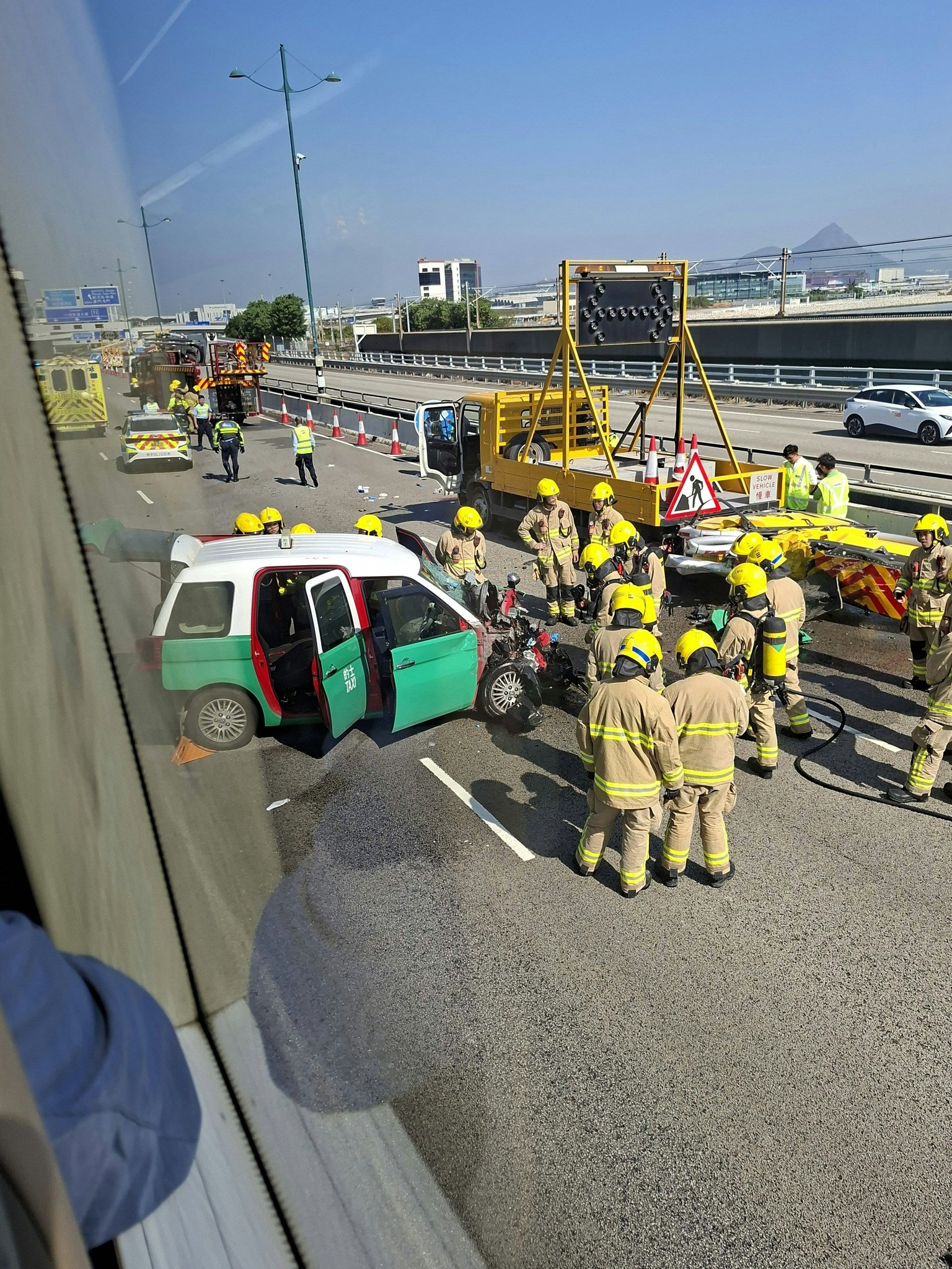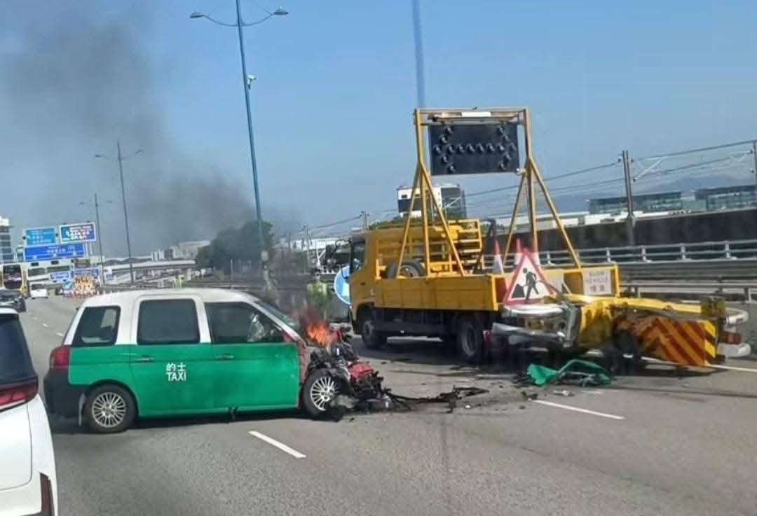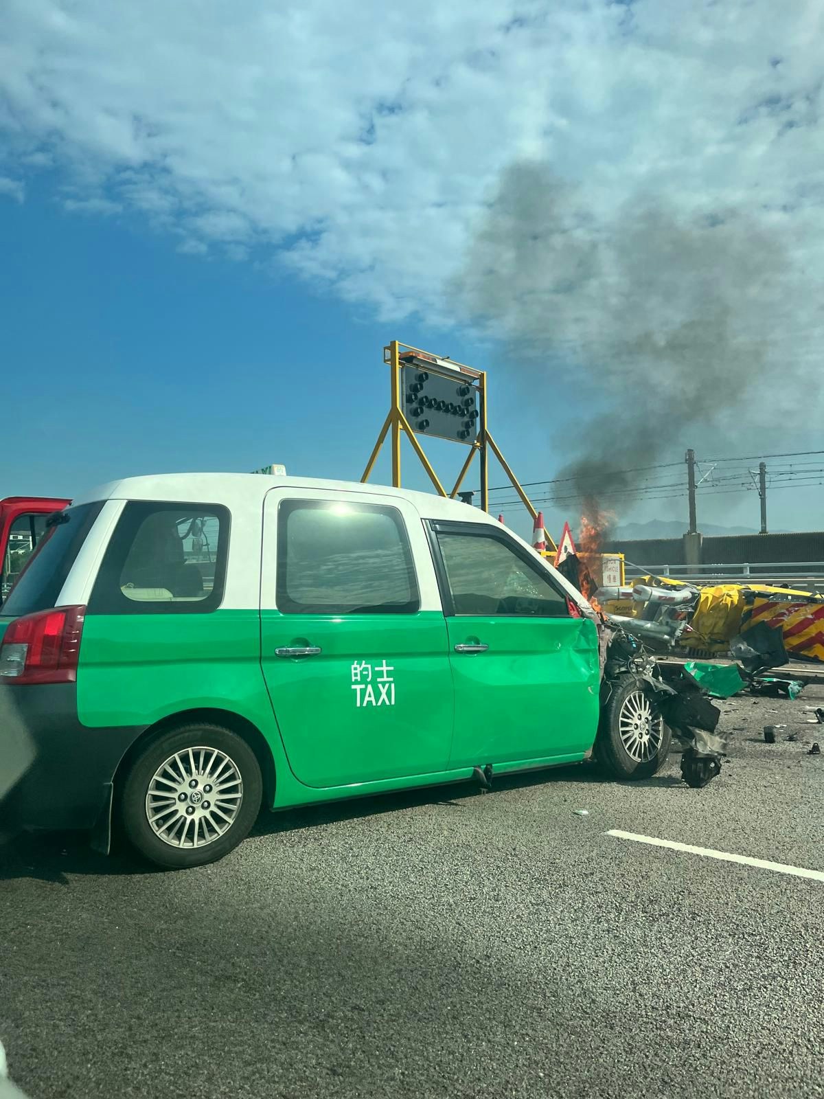 讀者提供的相片可見,俗稱「小露寶」的士撼落箭嘴車後車頭嚴重損毀,冒出火光及黑煙;停在快線的箭嘴車,其車尾位置的風琴式防撞欄被撞至變形。另外有影片可見,3名人員正合力將一名男子抬離危險位置。