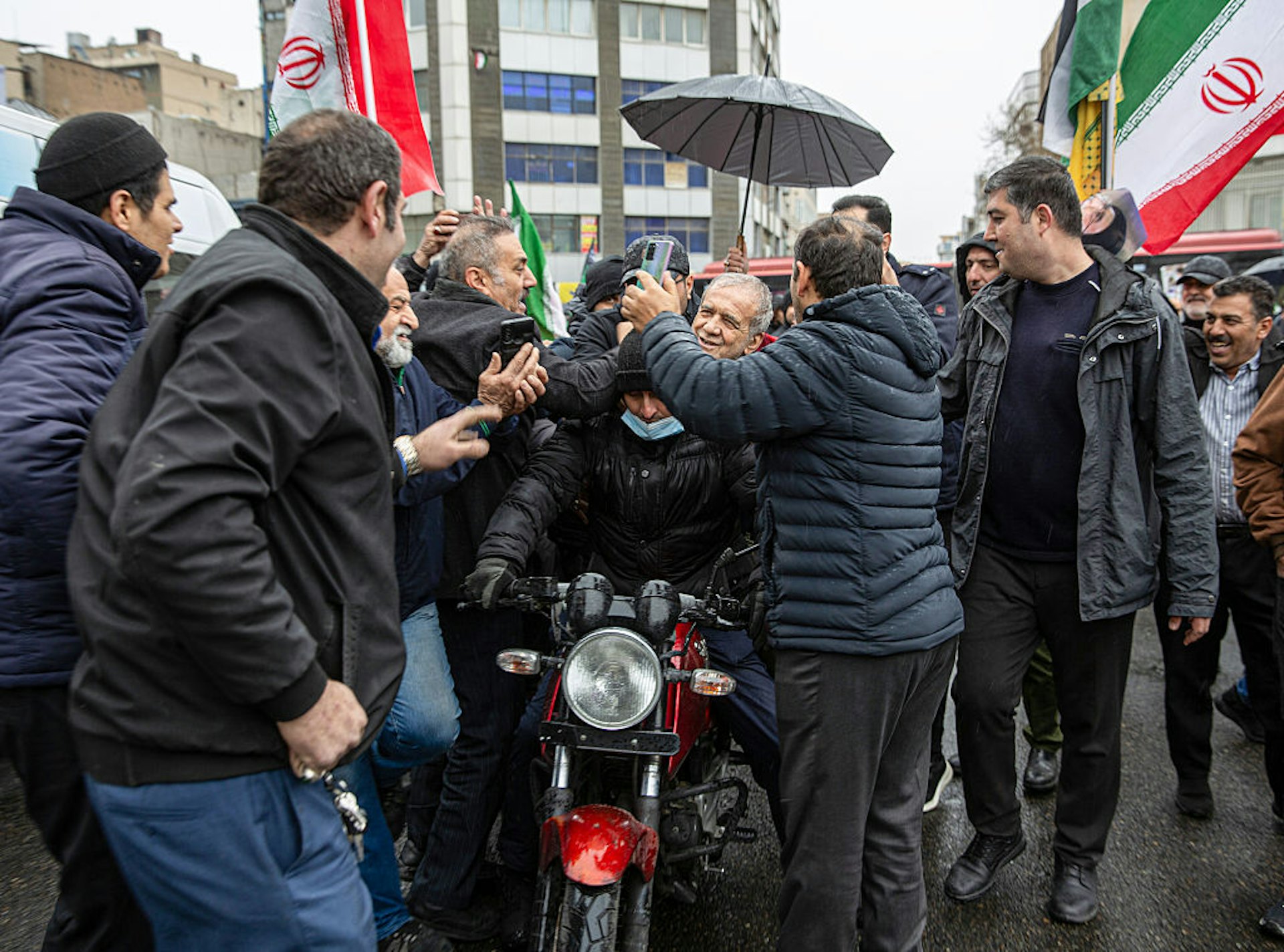 + h% S& _/ f1 p0 t2 H5 U% C. ~公仔箱論壇2026年3月13日,伊朗德黑蘭,伊朗總統佩澤希齊揚(Masoud Pezeshkian)出席聖城日(Quds Day)遊行時與民眾合影。(Getty)