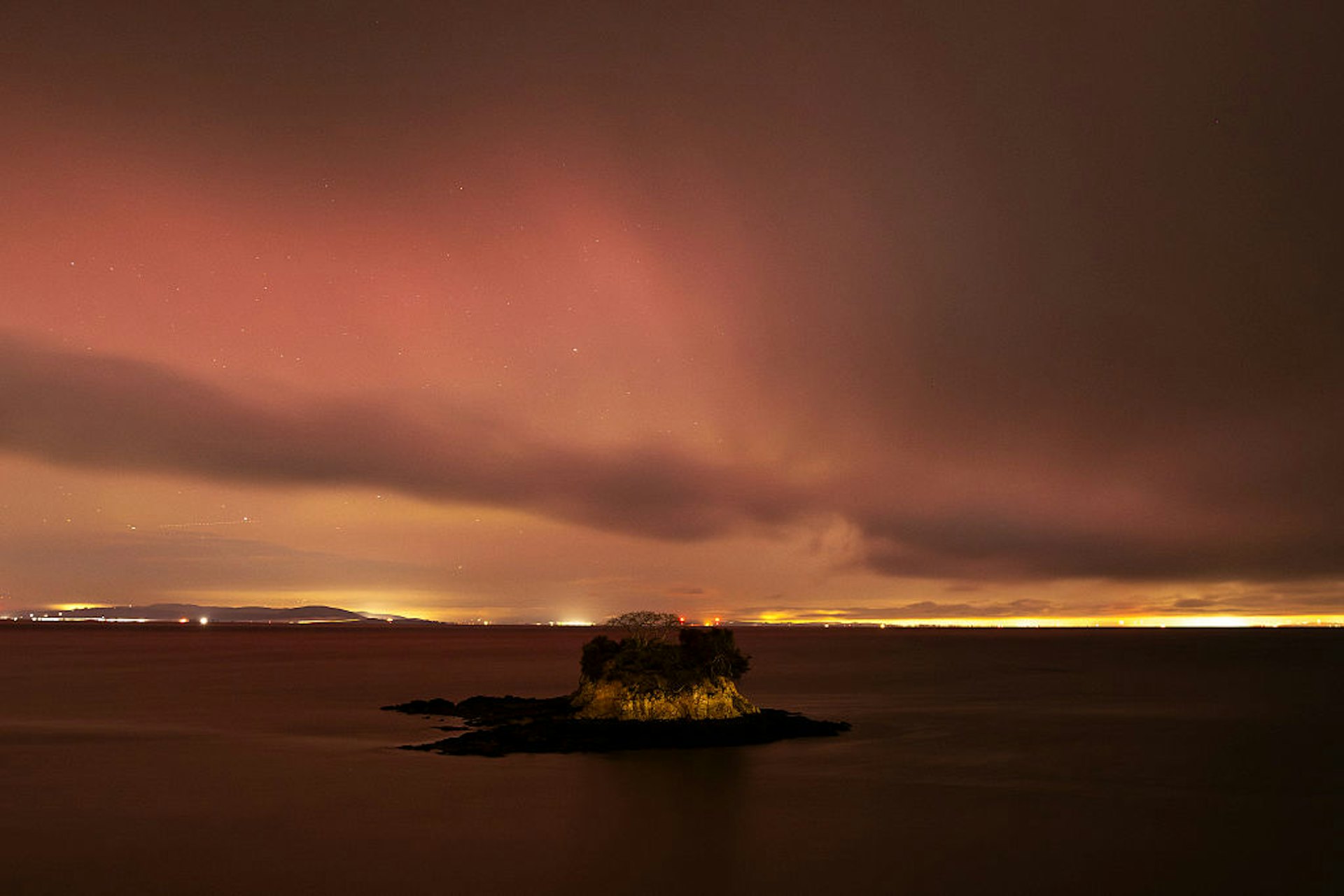 " ]! f% {6 y) ~2 i2025年11月11日,美國加州聖拉斐爾(San Rafael)的China Camp State Park,北極光在翻滾的霧氣之上閃耀。(Getty)# L4 F" N- ^, G