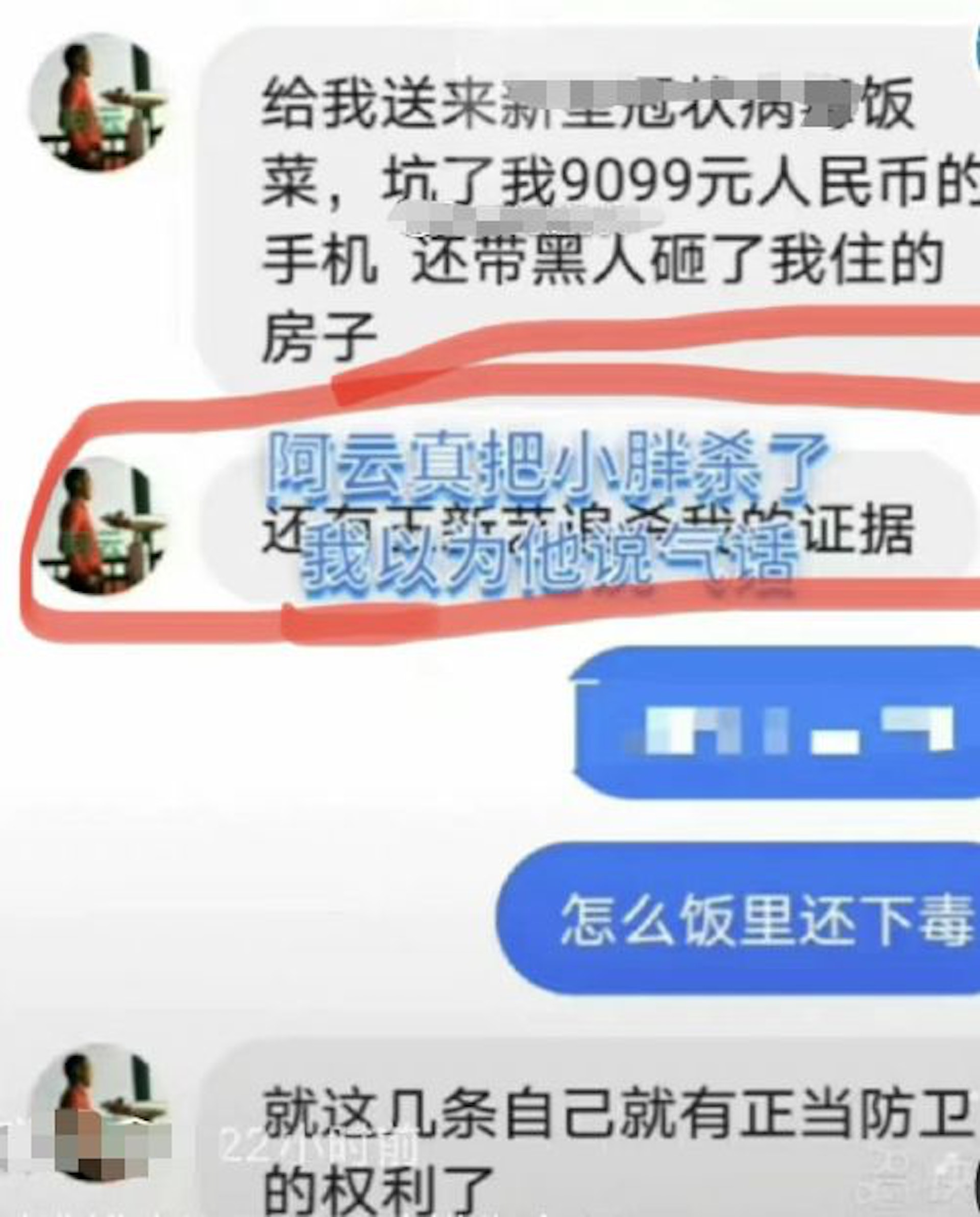 8 U& R5 j$ Q6 f) t5 ?阿云聲稱,小胖還給他送去有「新冠病毒」的飯菜,甚至還與當地黑人一起砸了他的房子,他忍無可忍下才會「正當防衛」。 |