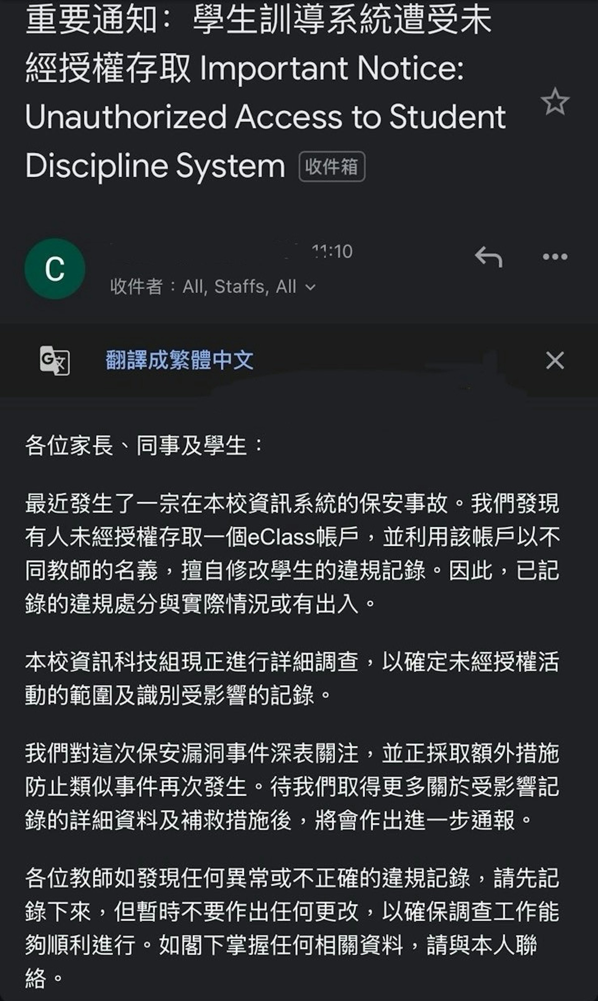 皇仁書院校內學生訓導系統出現「保安事故」。《香港01》獲悉該校資訊科技組今(22日)向老師、學生及家長發出內部電郵,指發現有人未經授權存取學生訓導系統一個eClass帳戶,並以不同教師的名義,擅自修改學生違規記錄。tvb now,tvbnow,bttvb: G1 Z. e4 ?# w% o