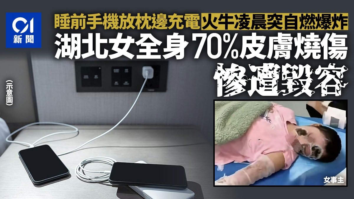 內媒《猛獁新聞》報道,12月25日,湖北一名女子睡覺前習慣性地將手機放在枕邊充電,但在凌晨時分,手機充電器自燃爆炸,導致她全身70%的皮膚被燒傷,面部和四肢嚴重燒傷,將留下大面積疤痕,慘遭毀容。