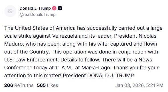 【17:23】特朗普證實美方空襲委內瑞拉,指行動成功。他更稱「馬杜羅總統及其夫人已被擒獲並帶出境外。」