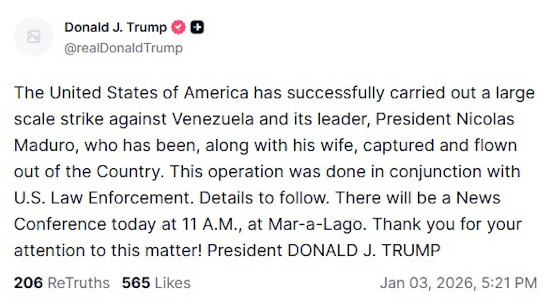 $ N) y$ J: C) |) J5 _; C `5 T. @% kwww.tvboxnow.com特朗普在社交網站帖文稱,「美國已成功對委內瑞拉及其領導人馬杜羅發動大規模攻擊,馬杜羅總統及其夫人已被擒獲並帶出境外,這次行動與美國執法部門聯合進行。詳情稍後公布。今天(美國時間)上午11點將在海湖莊園舉行記者會。感謝你對此事的關注!」特朗普在社交網站的帖文tvb now,tvbnow,bttvb2 _2 G- o( o( I* u; F