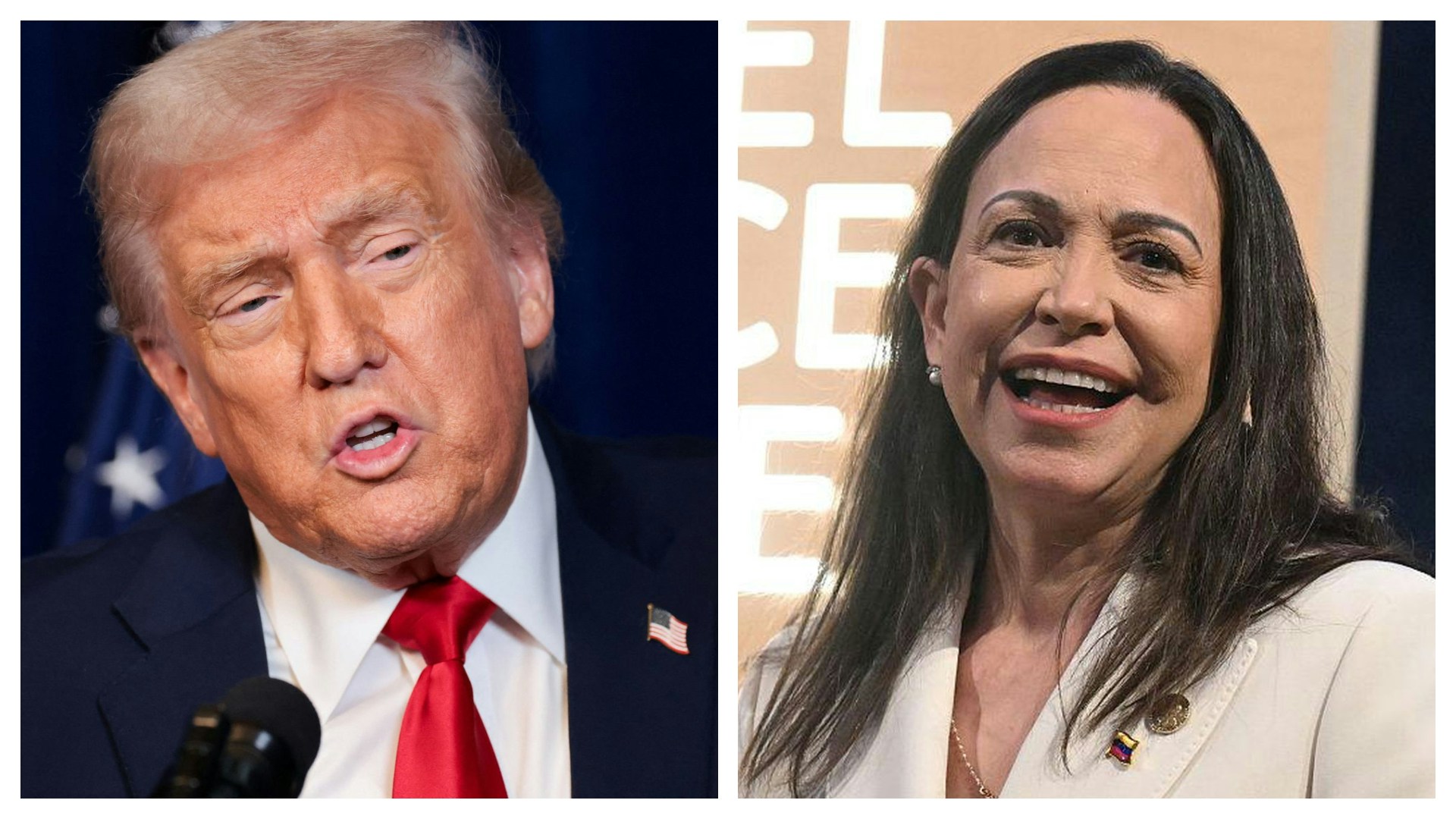左圖:圖為2025年12月29日,美國總統特朗普(Donald Trump)與以色列總理內塔尼亞胡(Benjamin Netanyahu,不在圖中)右圖:2025年12月11日,挪威奧斯陸,圖為獲得2025年諾貝爾和平獎的委內瑞拉反對派領袖馬查多召開記者會。(Getty)