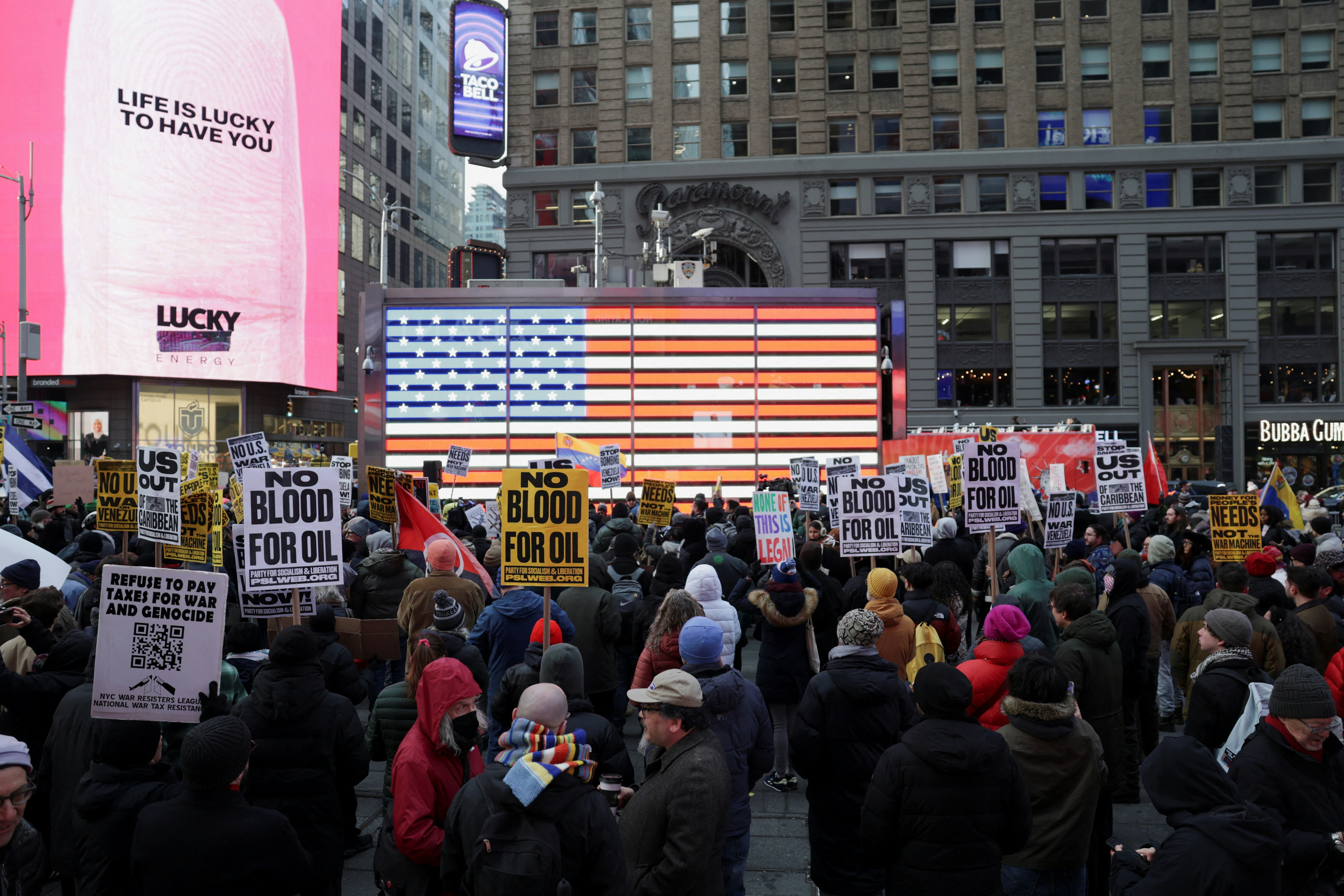 2026年1月3日,美國紐約時代廣場,人們舉行反戰示威集會,反對美國突襲委內瑞拉。(Reuters)" r" T: \ b5 J: {