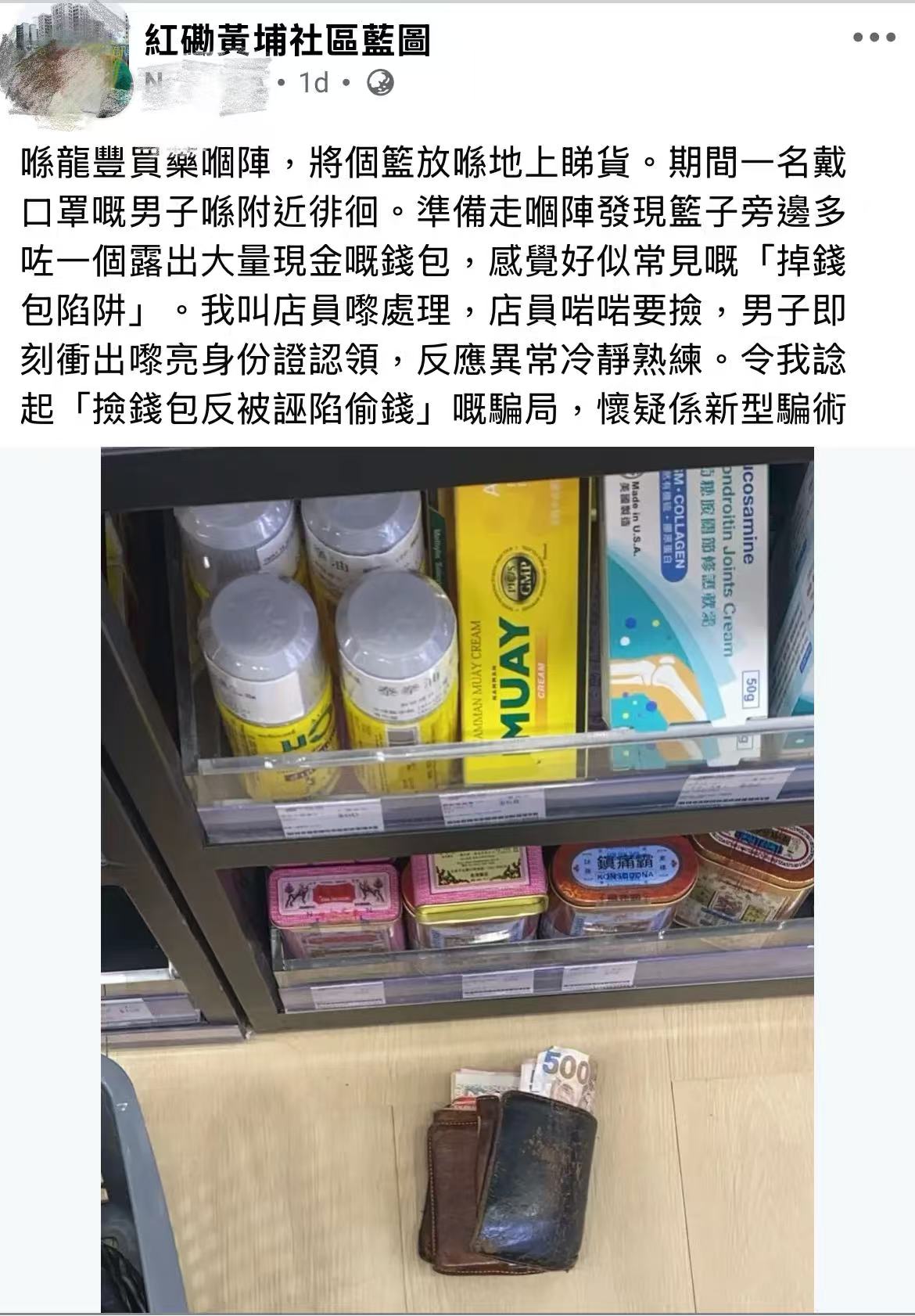 有網民發帖稱在一間大型連鎖藥房購物時遇到可疑事件,懷疑險陷入「撿錢包反被誣陷偷錢」騙局。(facebook群組「紅磡黃埔社區藍圖」)