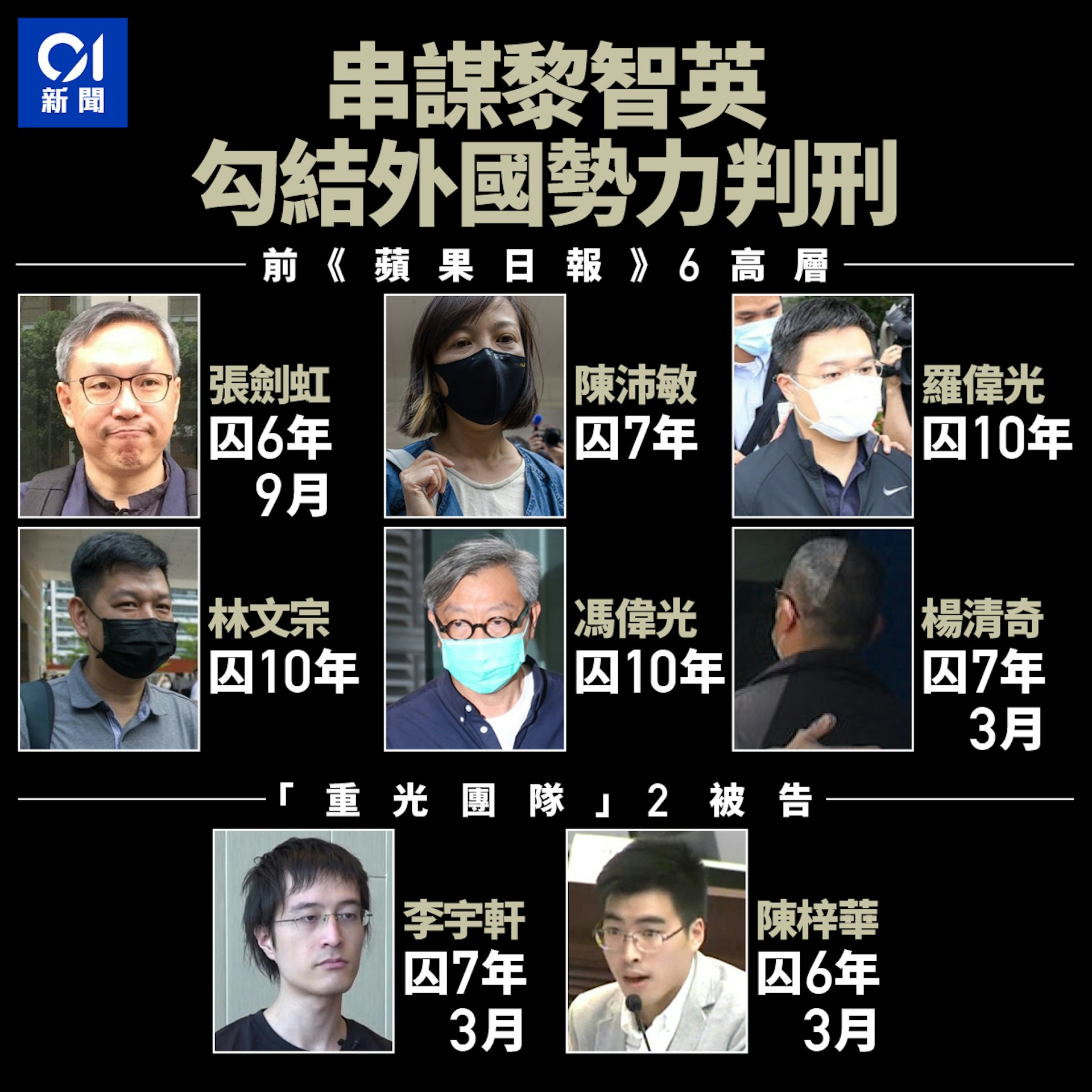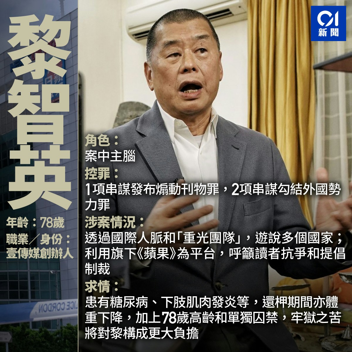 壹傳媒創辦人黎智英,被指用其國際人脈,在2019年更透過「重光團隊」,極力遊說多個國家,向中港兩地政府及官員作出制裁。他又同時利用旗下的《蘋果日報》,煽動市民上街和與政府抗爭,被指違反《國安法》。黎經過156天審訊後,他和三間《蘋果》相關公司,被裁定串謀勾結外國勢力罪及串謀煽動共三罪罪成。6名《蘋果》高層,以及重光團隊的兩名成員李宇軒和陳梓華,早前亦已承認相關罪名。連同黎等9名被告,今早(9日)十時將在西九龍法院(暫代高等法院)判刑。TVBNOW 含有熱門話題,最新最快電視,軟體,遊戲,電影,動漫及日常生活及興趣交流等資訊。5 m' N# j m+ i1 V u# N