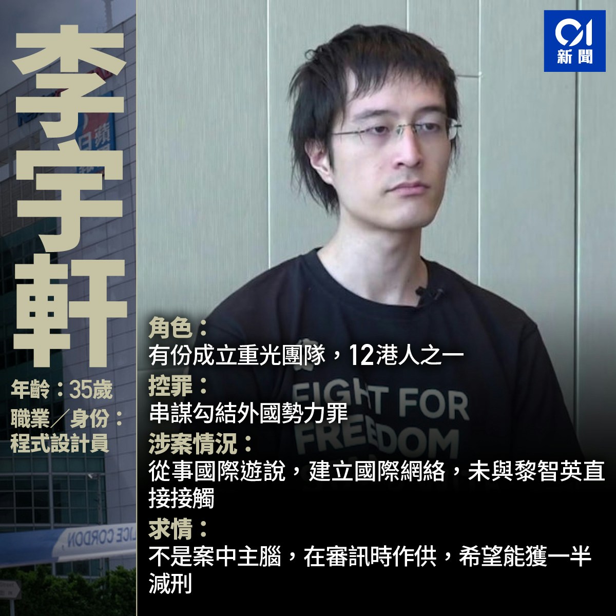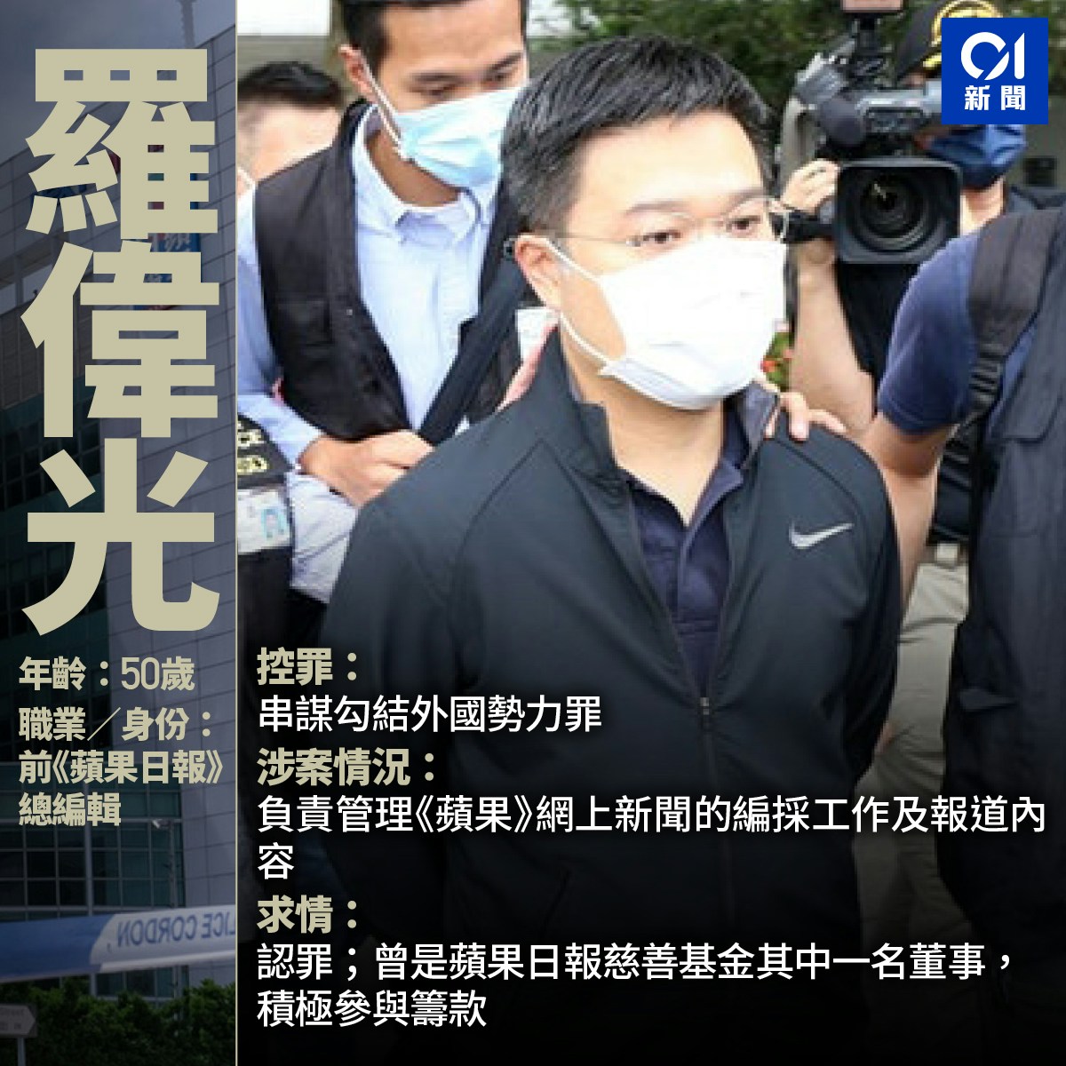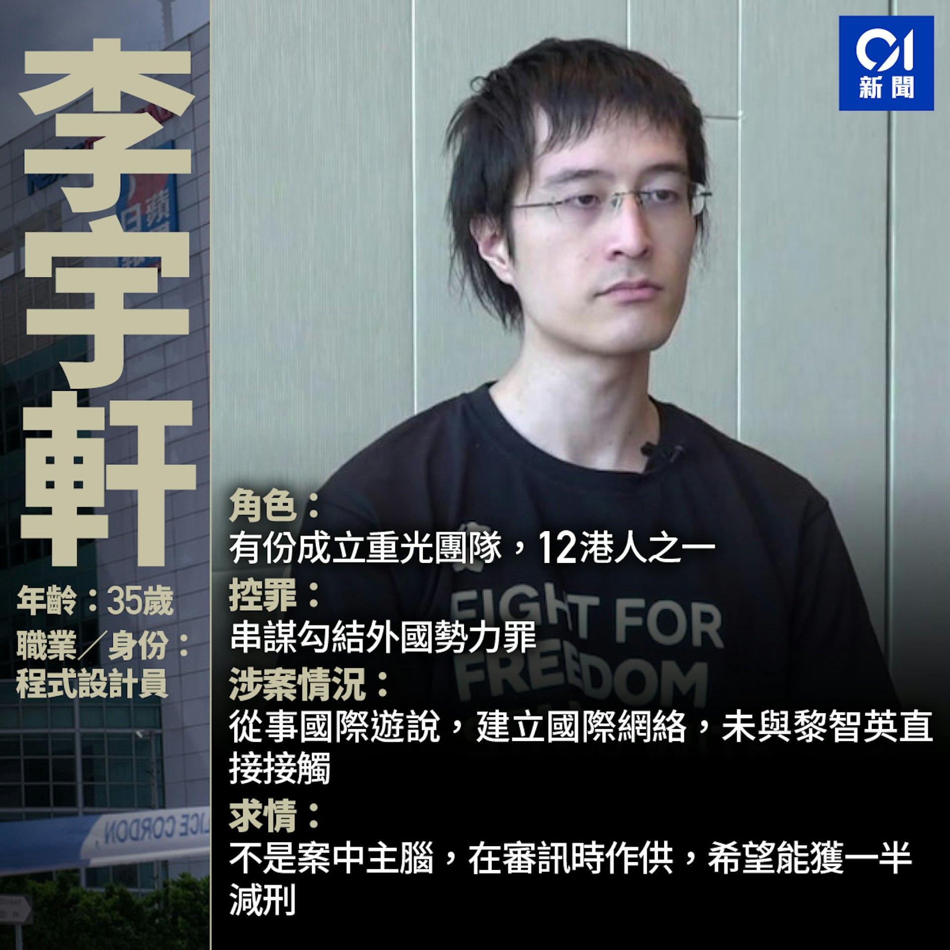 《蘋果》6名高層和重光團隊的李宇軒和陳梓華,則在審訊前各承認1項串謀勾結外國勢力罪。