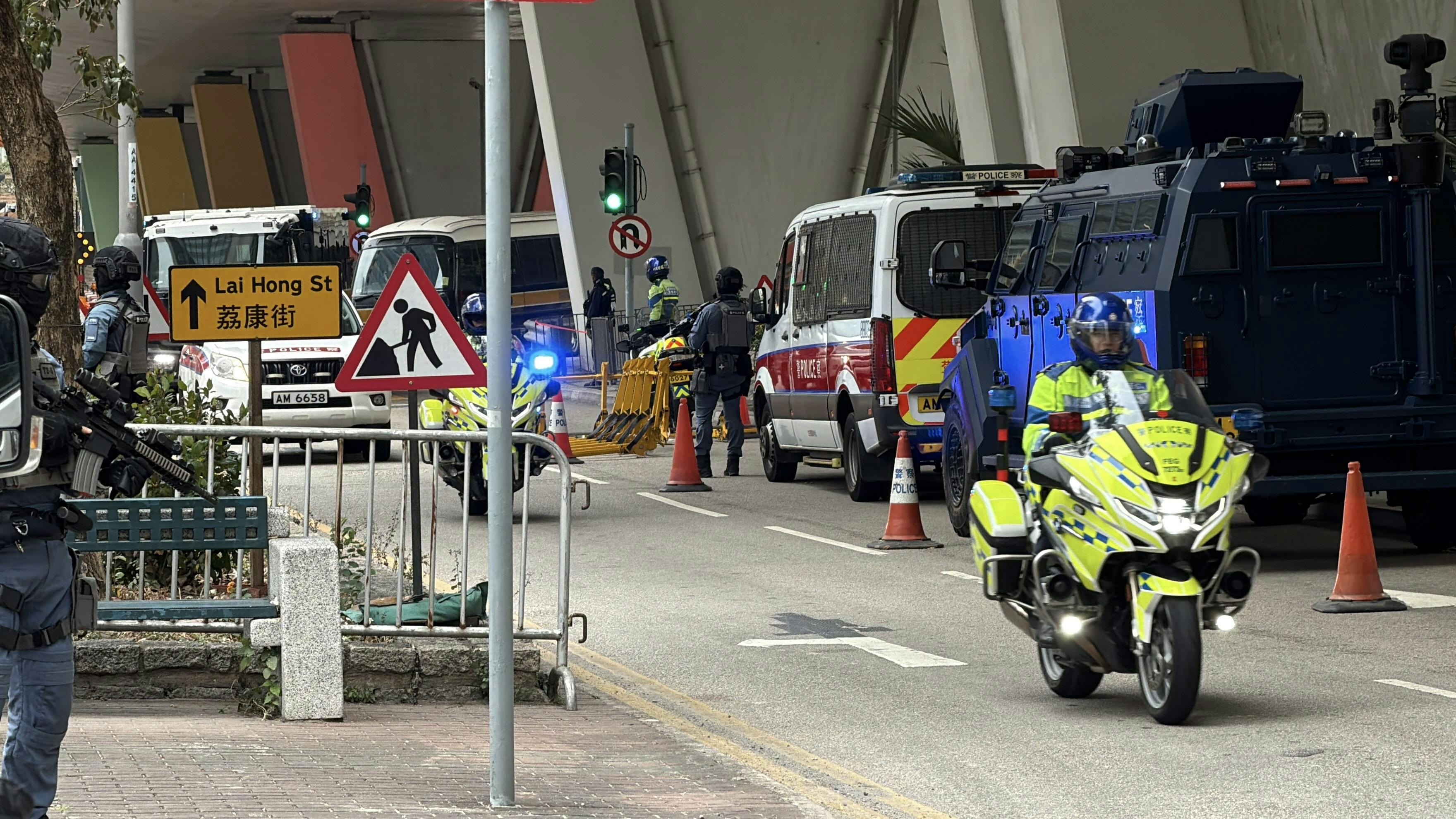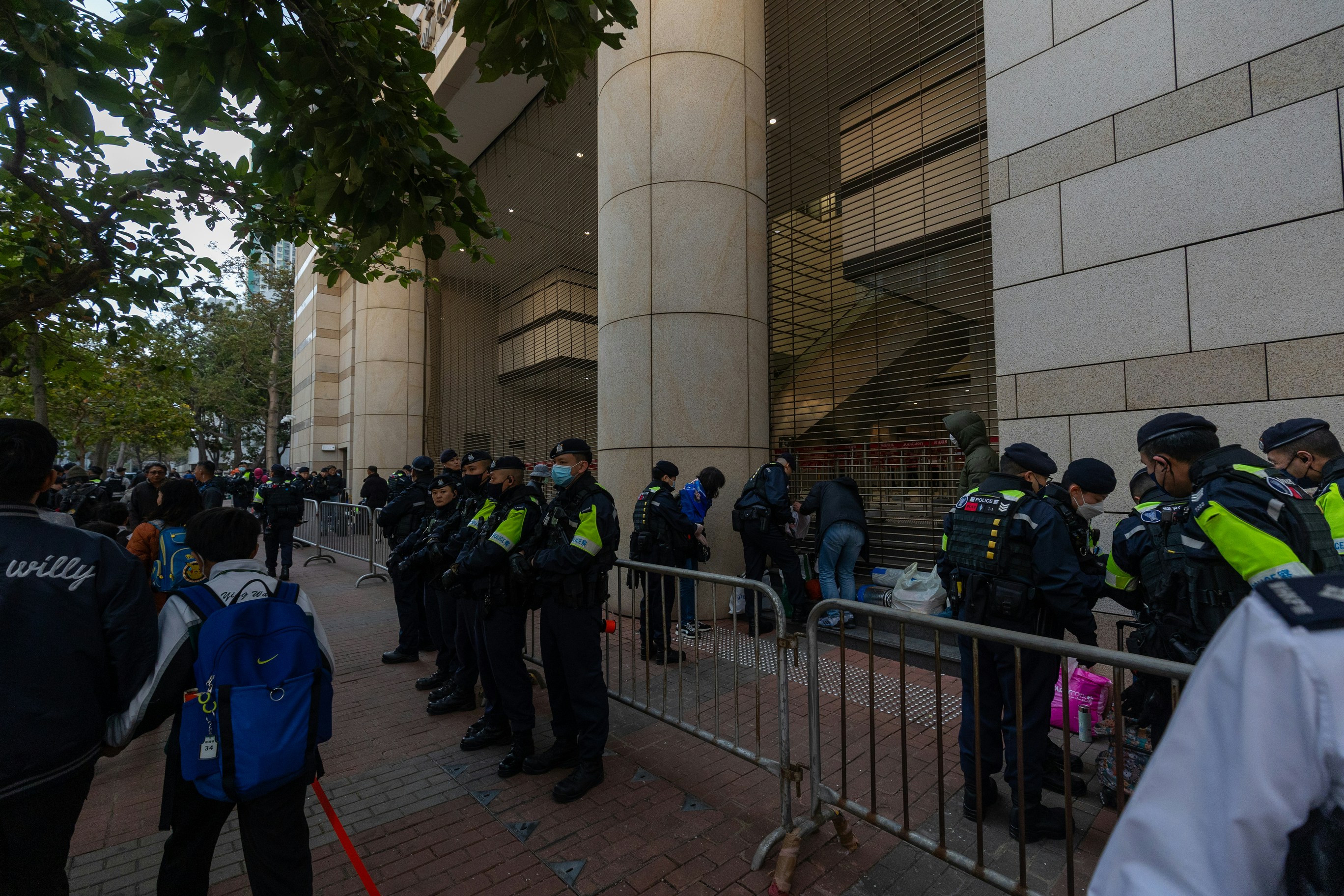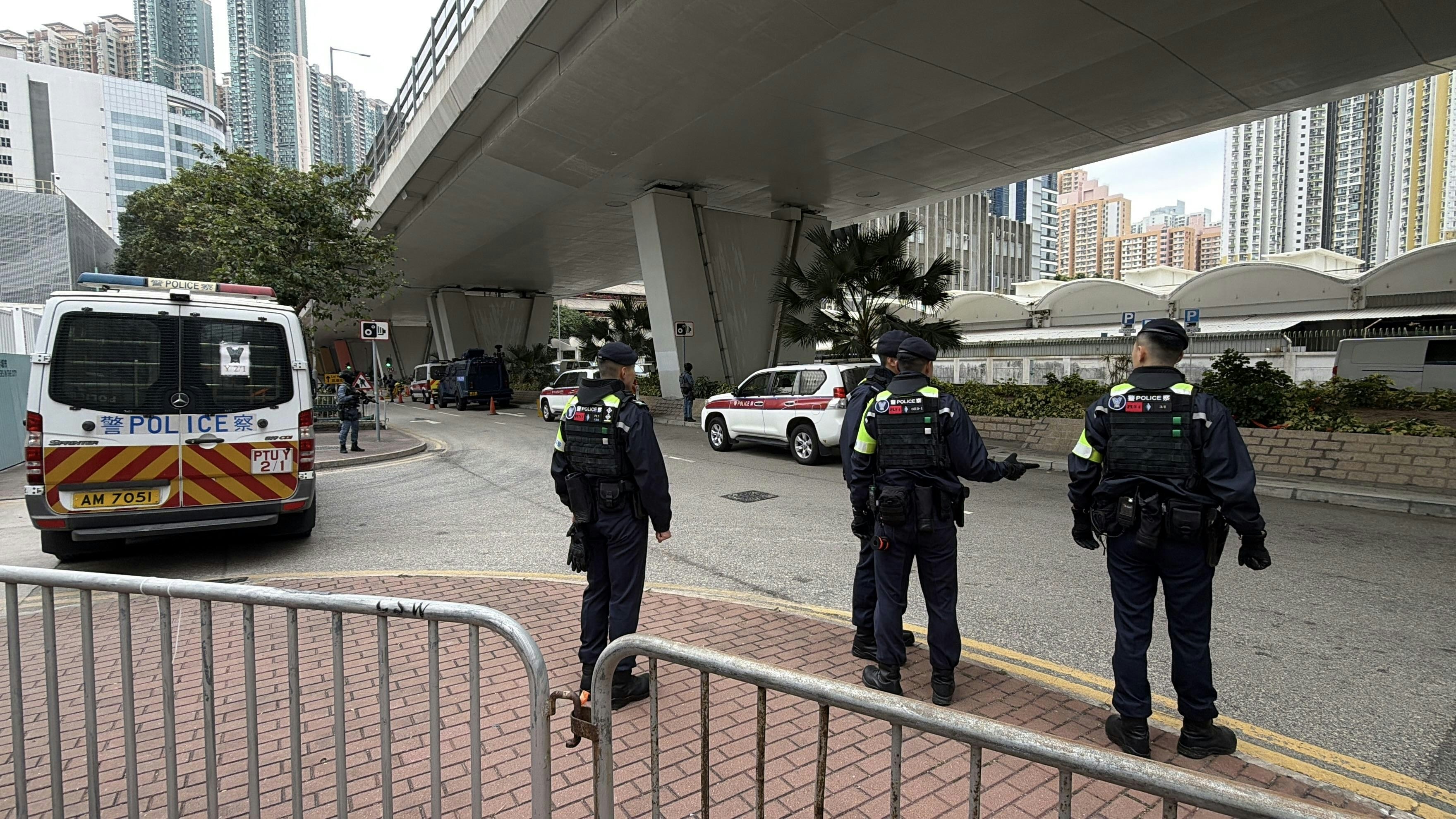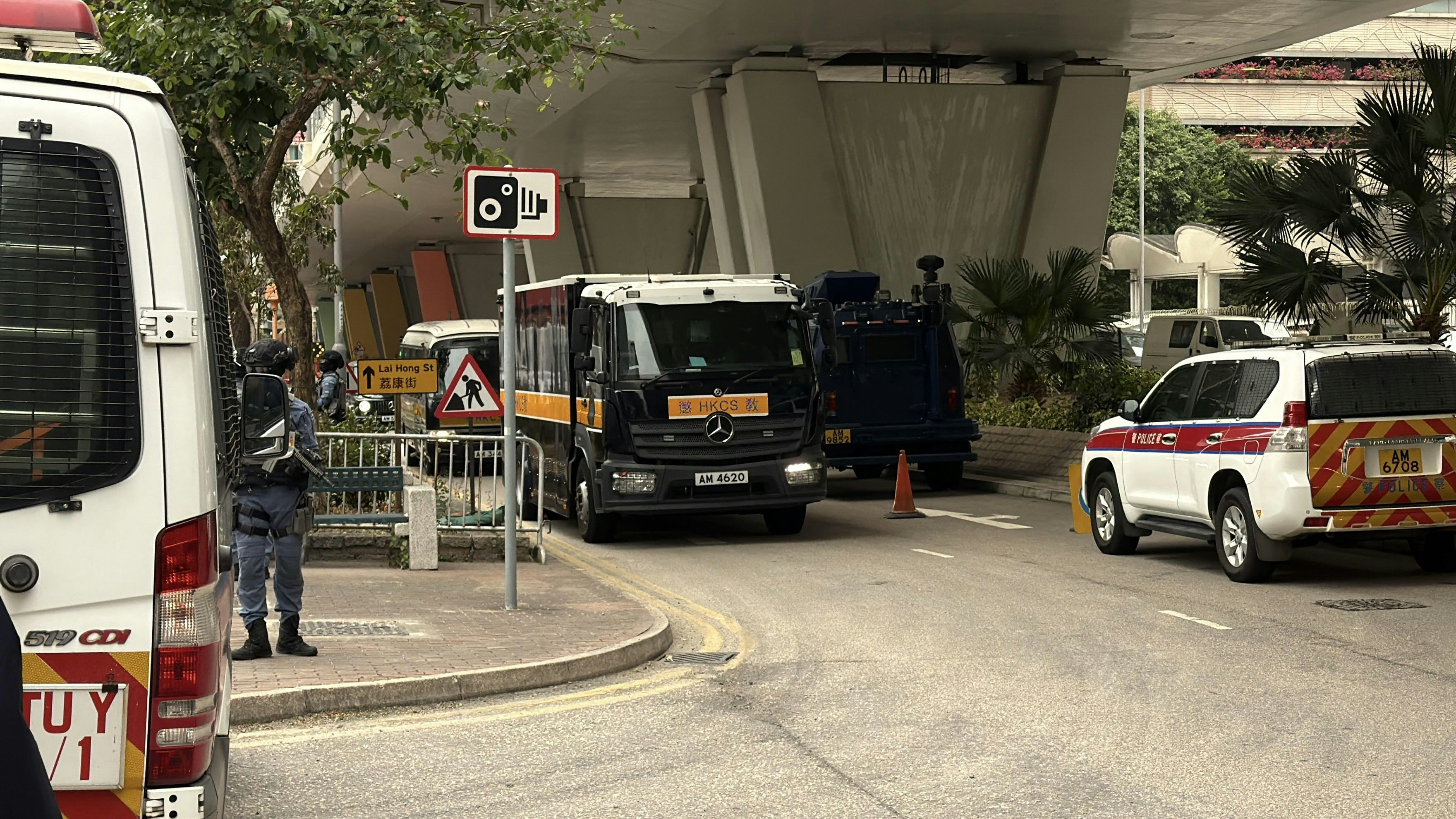 黎智英勾結外國勢力案2月9日判刑,早上西九龍裁判法院大樓外保安明顯加強,停泊多輛警車,大批警員在附近戒備,早上約9時30分,再有囚車抵西九龍裁判法。(馬耀文攝)" L B) I$ V9 a
