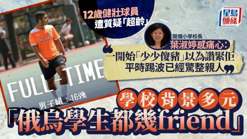 , L' s3 l$ r1 b全港小學校際七人足球賽日前舉行四強、季軍戰、冠軍戰,官方其中一張宣傳海報以閩僑小學男子足球隊一名非華裔球員作主角,惟其健碩身形及疑似「超齡」的身高,意外引來網民熱議,質疑他是否真為小學生,甚至有網民對其冷嘲熱諷,部分可能帶種族歧視成分。閩僑小學校長葉淑婷今早(17日)大年初一於商台節目表示,該名學生出賽前已查證清楚,確是12歲沒有超齡,又透露他平時踢球時已經知道自己很健壯,「一有波就踢走」避免身體接觸,對於網上有如此攻擊感到痛心。