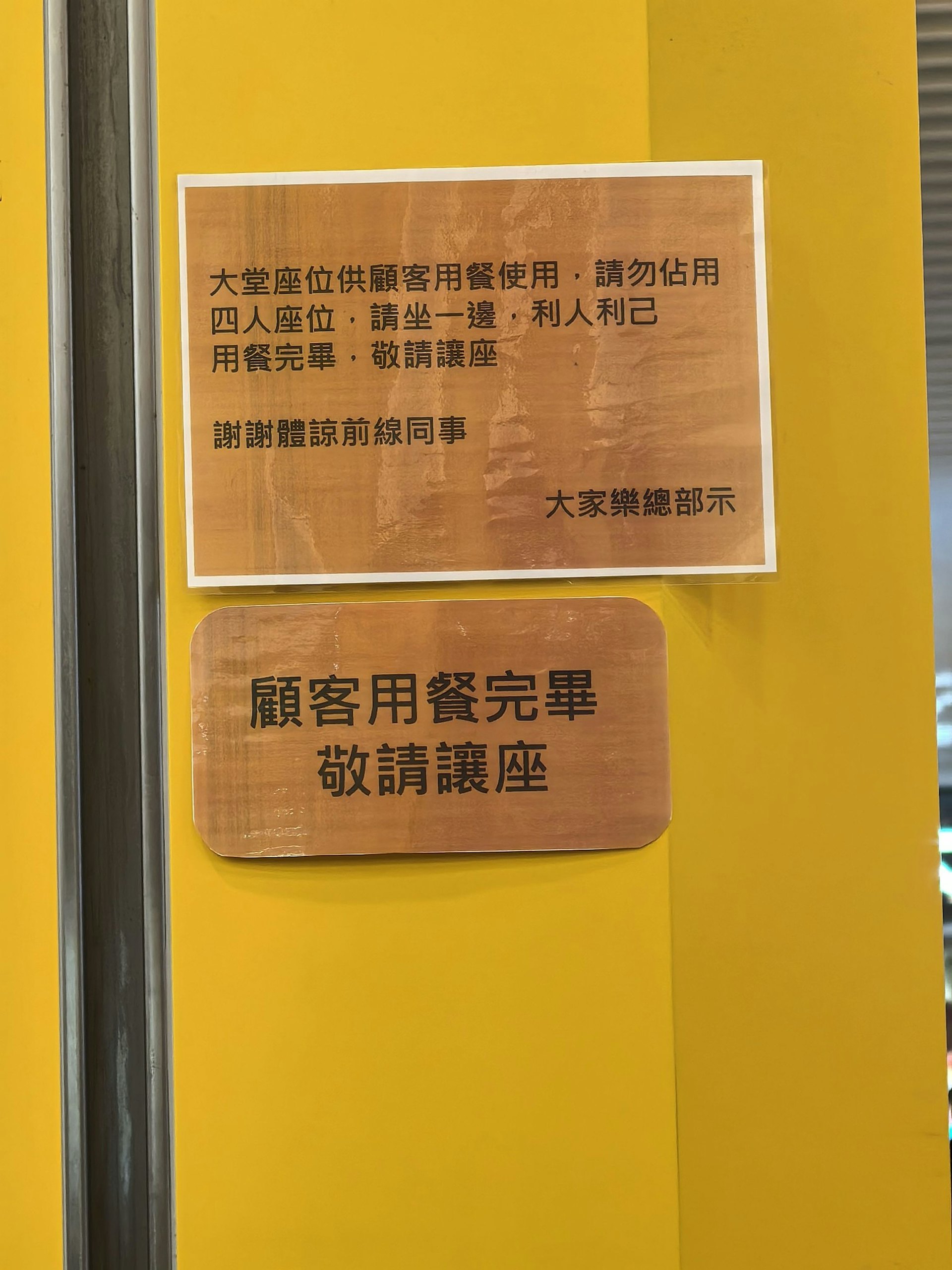 相片見到,大家樂於分店張貼告示,提醒「大堂座位供顧客用餐使用,請勿佔用四人座位,請坐一邊,利人利己」,更以「8字」寫上「用餐完畢,敬請讓座」,並呼籲「謝謝體諒前線同事」。