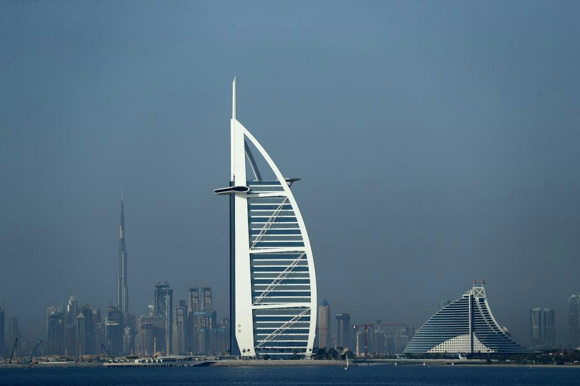 " W8 V9 U/ M: @5 U. K阿聯酋杜拜地標帆船酒店:2020年4月26日,杜拜帆船酒店(Burj al-Arab )、哈利法塔(Burj Khalifa)和朱邁拉海灘酒店(Jumeirah Beach Hotel)景色。(Getty Images)