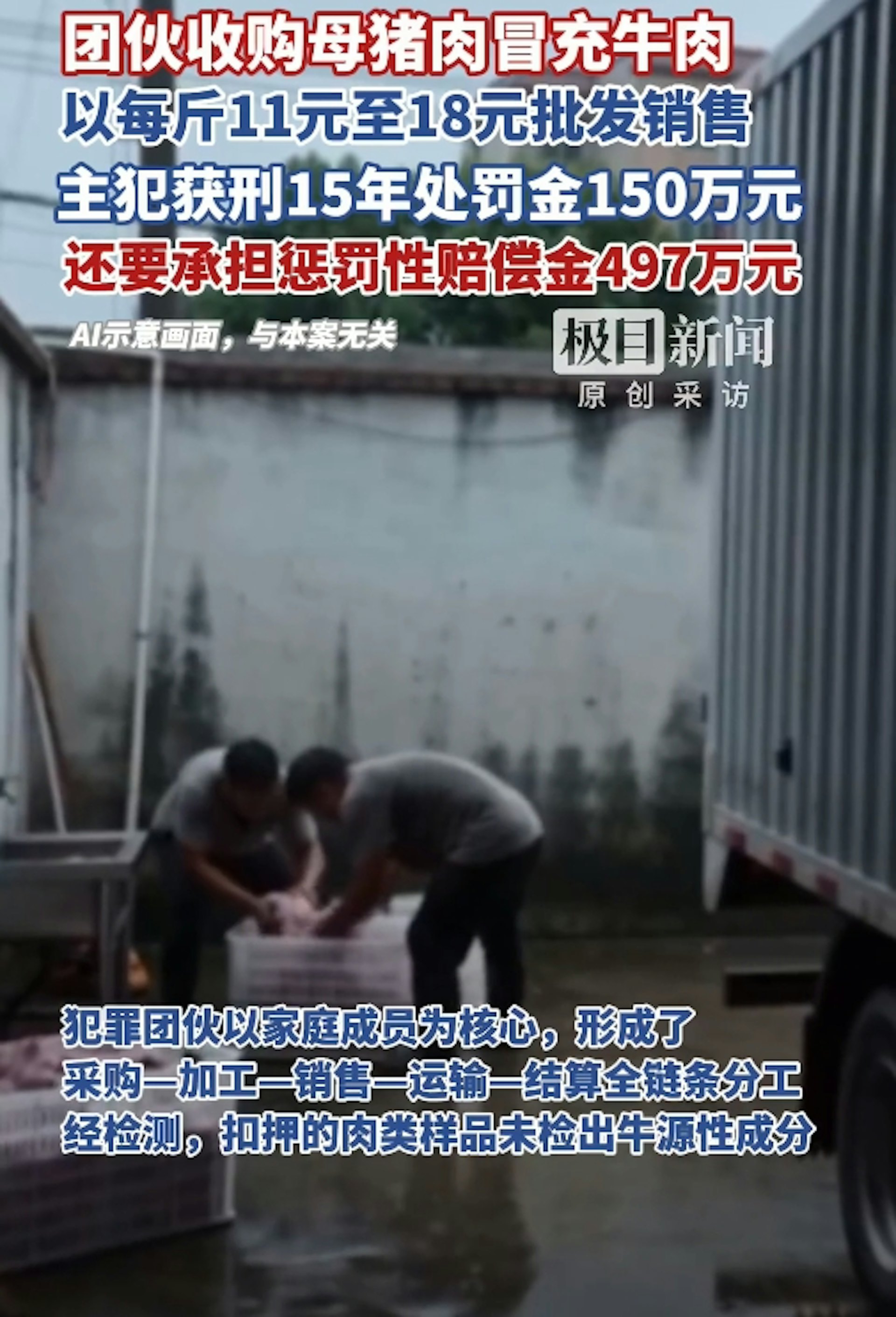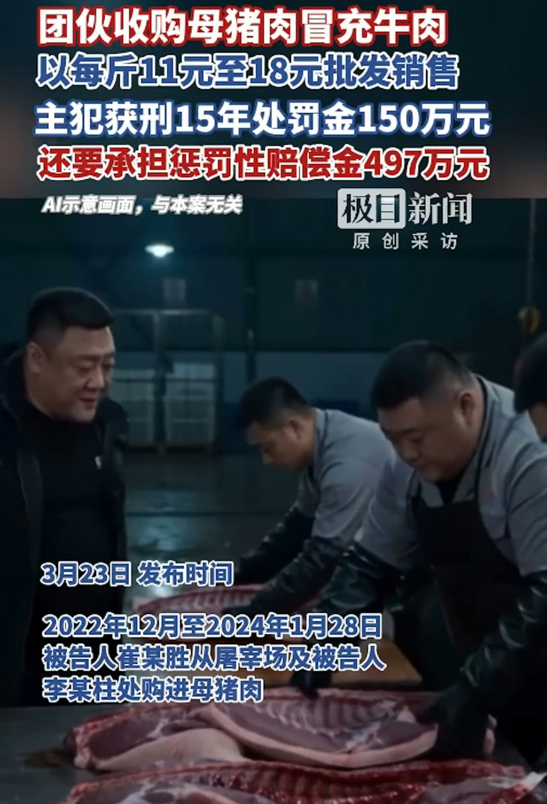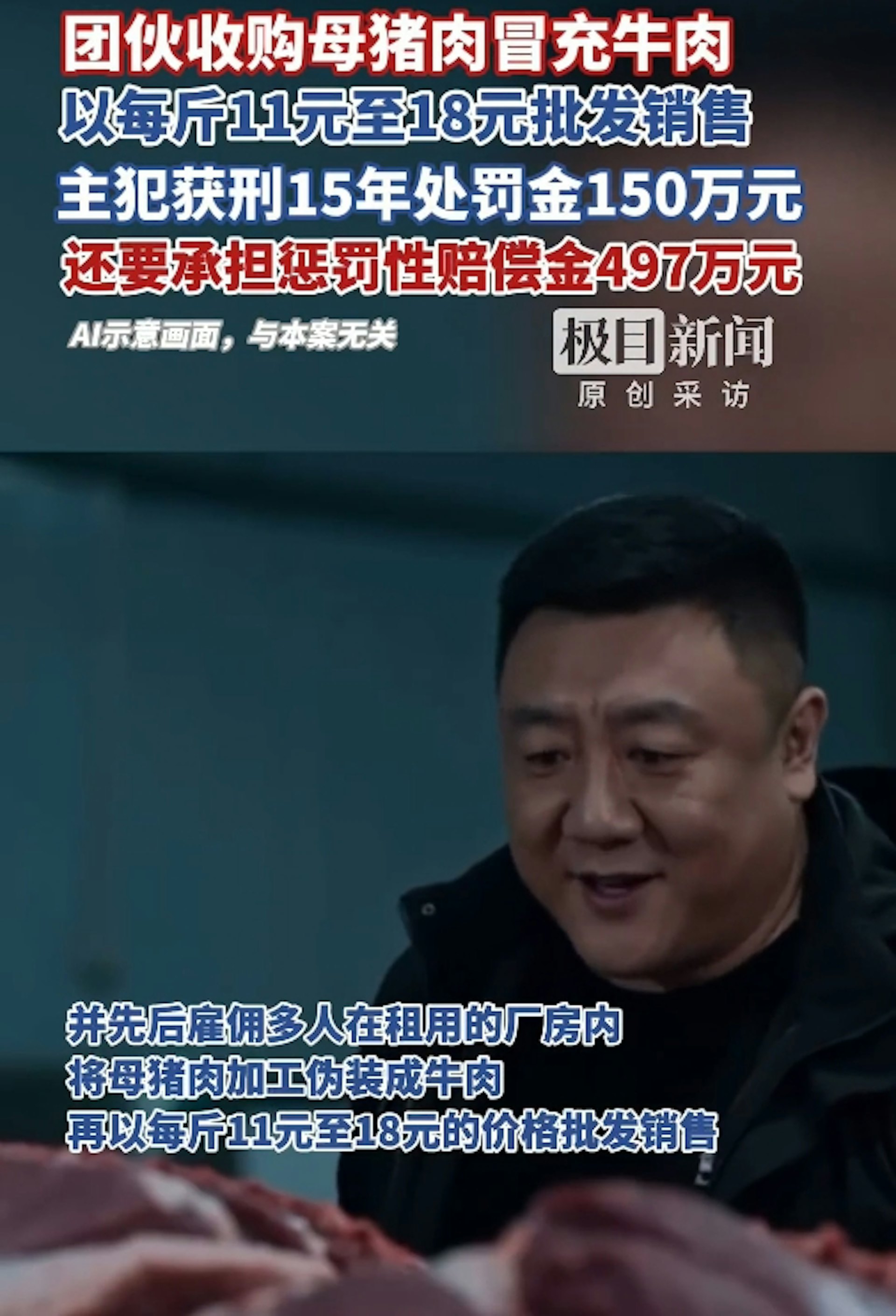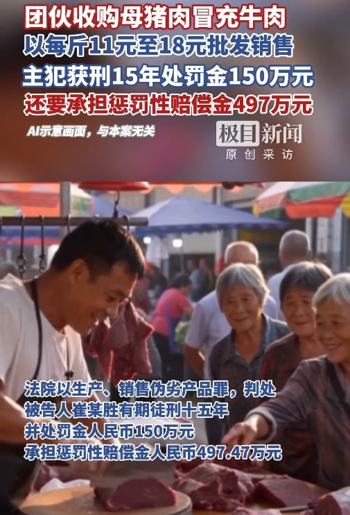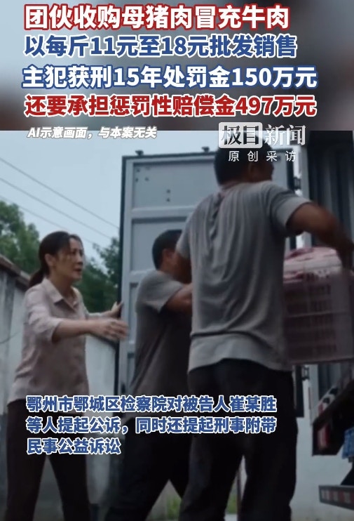 大陸湖北省鄂州市一起以母豬肉冒充牛肉的食品詐欺案,歷經一、二審定讞,主犯崔某勝被判處有期徒刑15年、罰金150萬元人民幣,並須承擔懲罰性賠償金497.47萬元人民幣。公仔箱論壇: v' v+ \ I6 c4 |