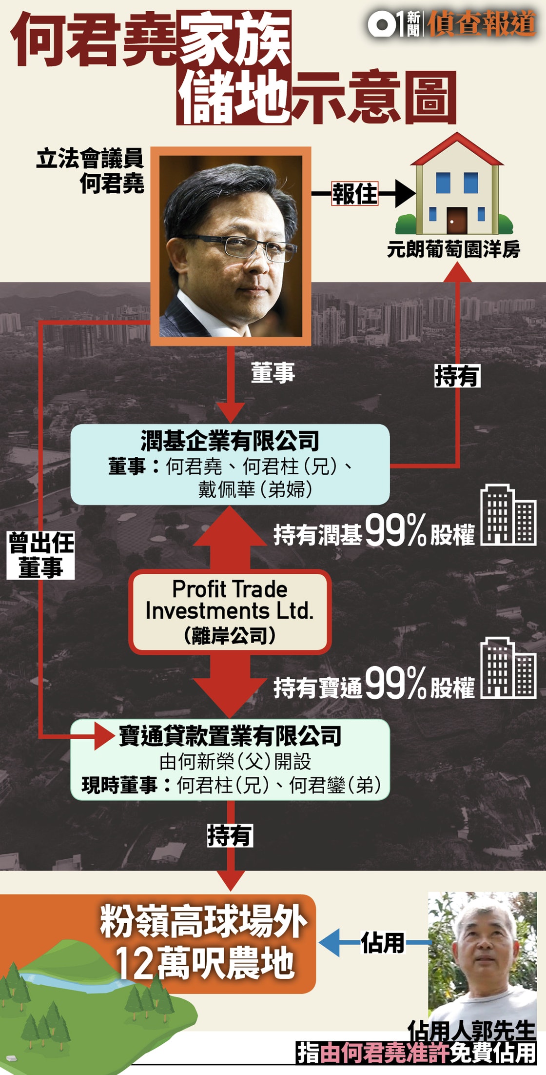 | 2013年1月 | 何君堯獲委任為「潤基」董事,其餘兩名董事為何君柱(兄)、戴佩華(弟婦)。 |