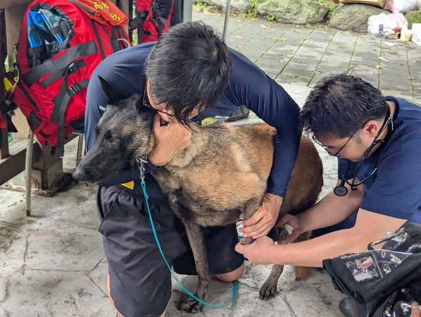 ▲台南特搜退有2名隨行獸醫師,正在為Dota做任務結束的例行檢查。(圖/翻攝自粉專「臺南搜救犬。Tainan K9」)