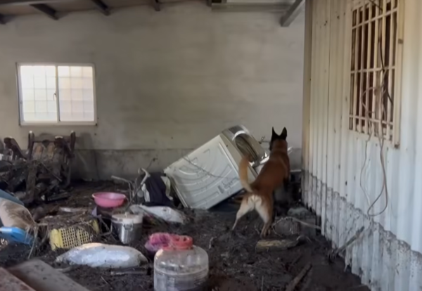 ▲Dota一進入受災民宅就躍躍欲試,一心想找到受困者。(圖/翻攝自粉專「臺南搜救犬。Tainan K9」)